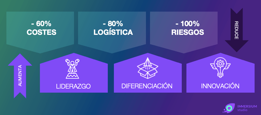 A parte de los beneficios pedagógicos, la Realidad Virtual también fomenta el desarrollo sostenible de una corporación o empresa. Reduce los costes un 60%, se ahorra en logística un 80% y se minimizan al máximo, en un 100%, los riesgos. En consecuencia, aumenta considerablemente el liderazgo, la diferenciación y la innovación de la corporación.
