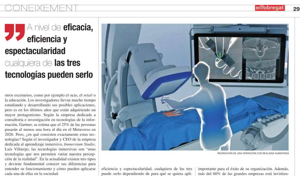 En aquest article s’explicava el funcionament de la Realitat Augmentada aplicada a la cirurgia i també l’ús de les tecnologies immersives en el camp de la sanitat. El nostre CEO, Luis Villarejo, explicava els tres tipus de tecnologies immersives: Realitat Virtual, Realitat Augmentada i Realitat Mixta, i com cada una d’elles té uns avantatges i uns inconvenients. Per exemple, des d’Immersium Studio vam formar a més de 20.000 professionals sanitaris europeus en temps de Covid per tal de proporcionar-los experiència en una Unitat de Cures Intensives (UCI) a través d’una experiència de Realitat Virtual.