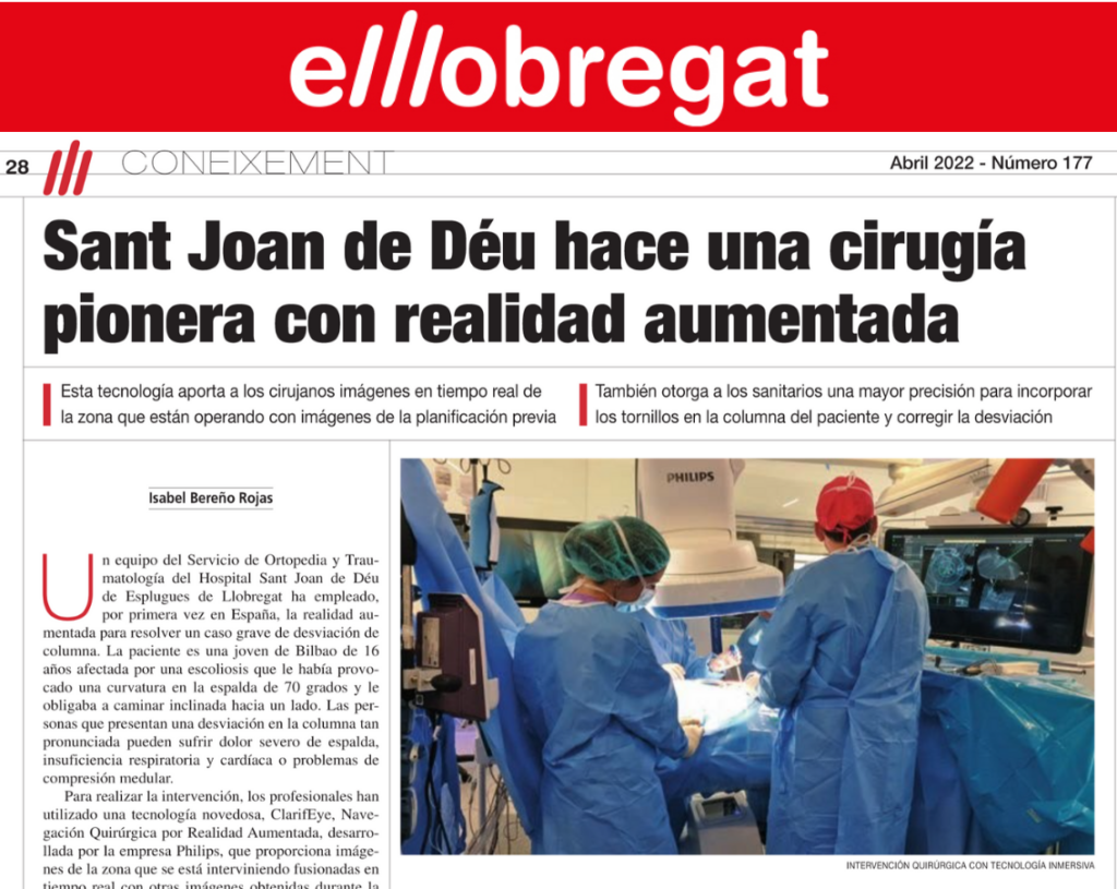 El diari El Llobregat va publicar el mes d’abril de l’any 2022, un article sobre cirurgia amb Realitat Augmentada, en el qual s’explicava com, per primera vegada a Espanya, un equip del Servei d’Ortopèdia i Traumatologia de l’Hospital Sant Joan de Déu d’Esplugues de Llobregat van fer servir la Realitat Augmentada per resoldre un cas greu de desviació de columna. L’article “Sant Joan de Déu fa una cirurgia pionera amb realitat augmentada” va ser publicat per Isabel Berreño Rojas, a la secció Coneixement del diari El Llobregat (Número 177).